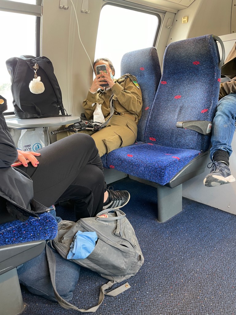 A rifle on public transportation in Israel is routine. In the U.S., the Woke culture dominates, and many people are scared of the American flag — so a rifle on a train would probably cause them a nervous breakdown and permanent trauma. A rifle barrel pointed toward me — toward my groin — during a continuous train ride is not a positive feeling. I moved to another seat and photographed the officer, whose weapon wasn’t just on her — the barrel was pointed between the legs of the woman who took my seat. Just an ordinary day in Israel.