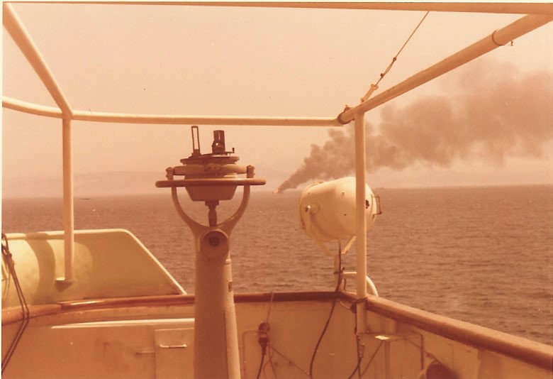 A view from the Samson [Oil Tanker] of the burning production tower in Abu Rudeis that was hit by an Israeli ‘Hawk’ missile