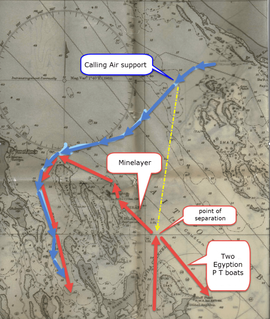 Since the area was small and relatively defined, the planes dropped flares, and the Egyptians began fleeing toward the straits north of Shadwan Island. The aircraft couldn’t spot or identify the targets and returned to base. The targets were moving faster than us, so they gained distance and disappeared south of Shadwan Island—except for one boat that was sailing slowly toward Sha’ab Ashrafi. We understood there was still a chance for contact and continued the chase.